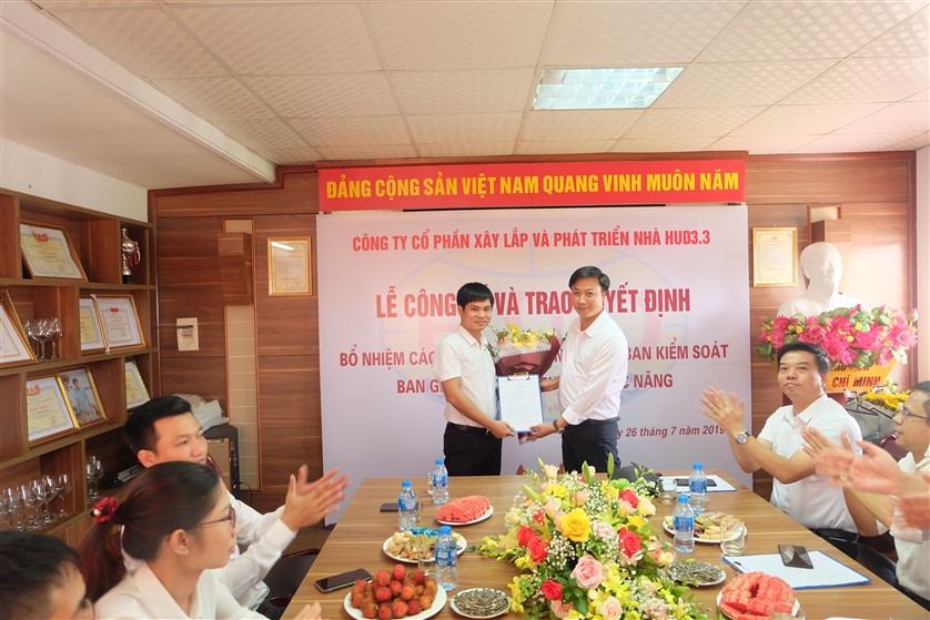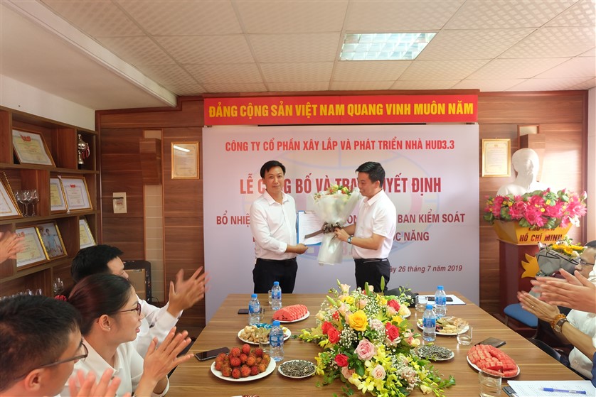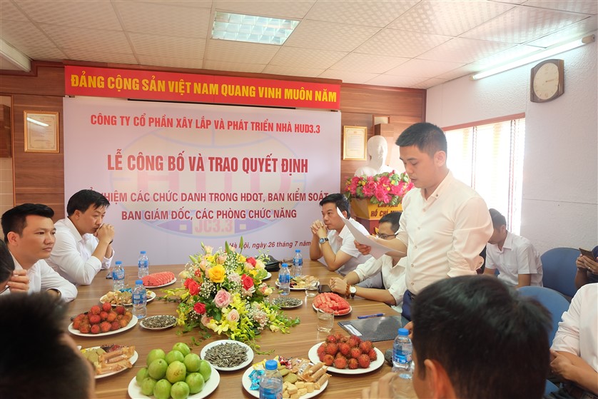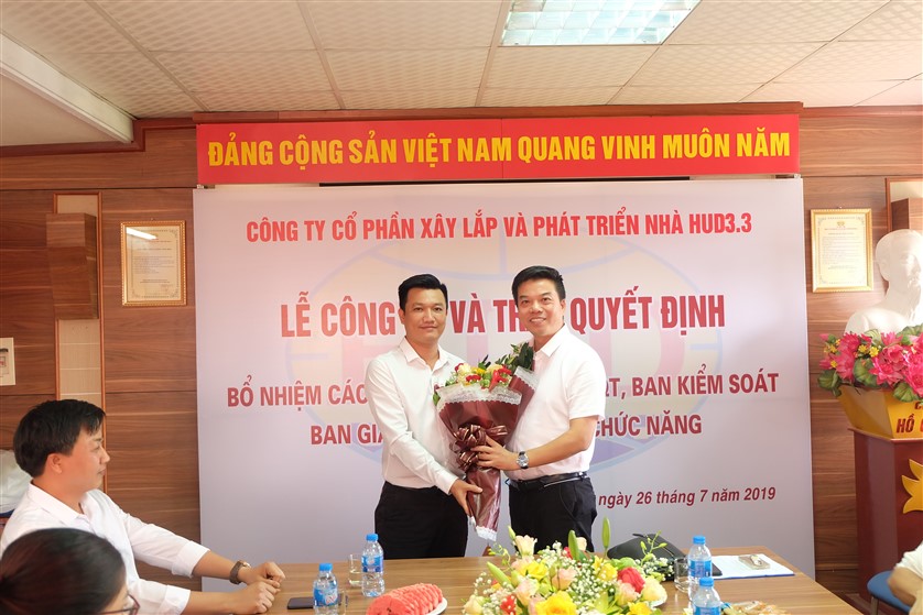 Ngày 26/07/2019 vừa qua, tại trụ sở Công ty HUD3.3 đã diễn ra Lễ công bố và trao quyết định bổ nhiệm chức danh trong HĐQT, Ban kiểm soát, Ban giám đốc, các phòng chức năng Công ty.