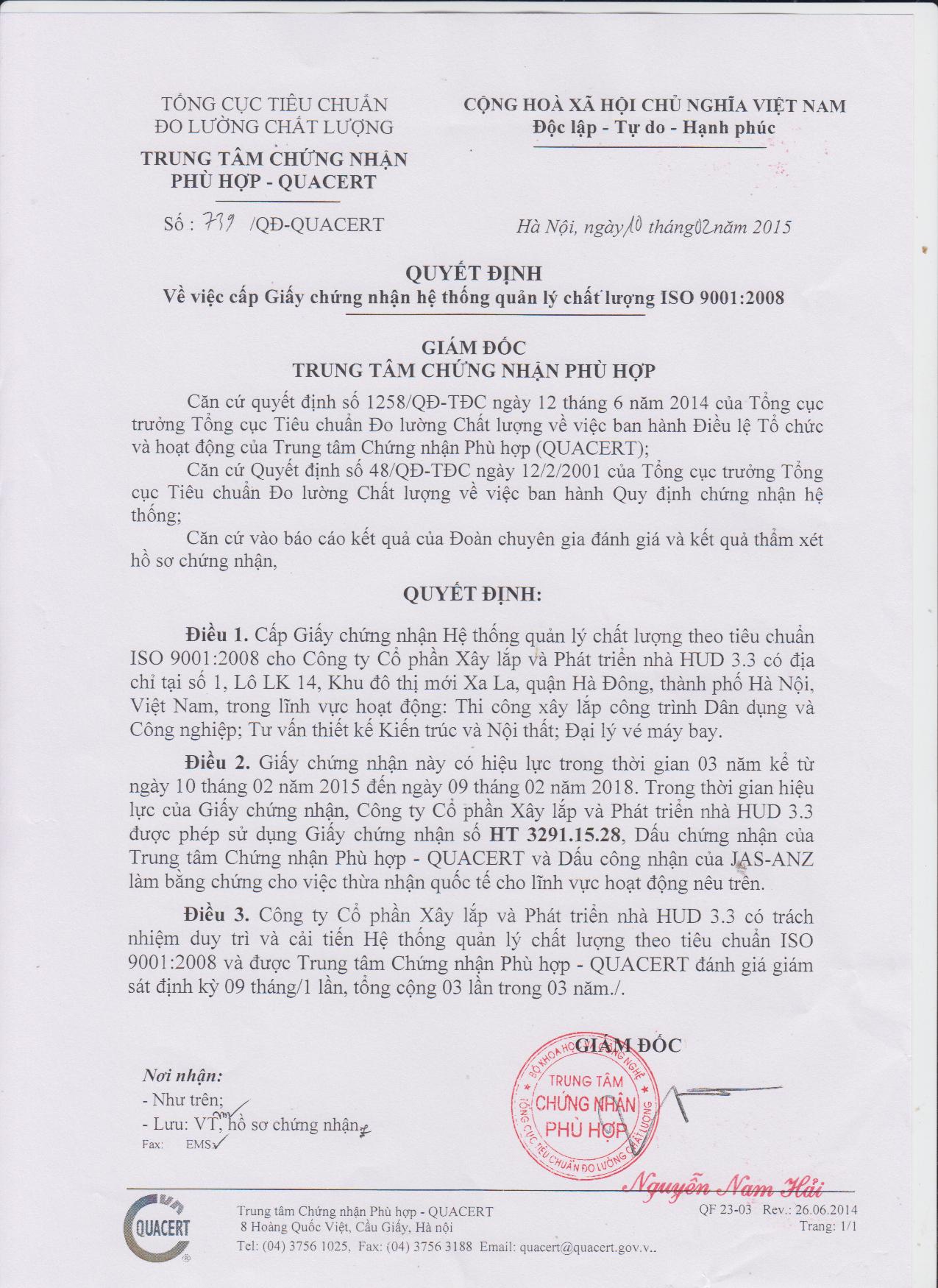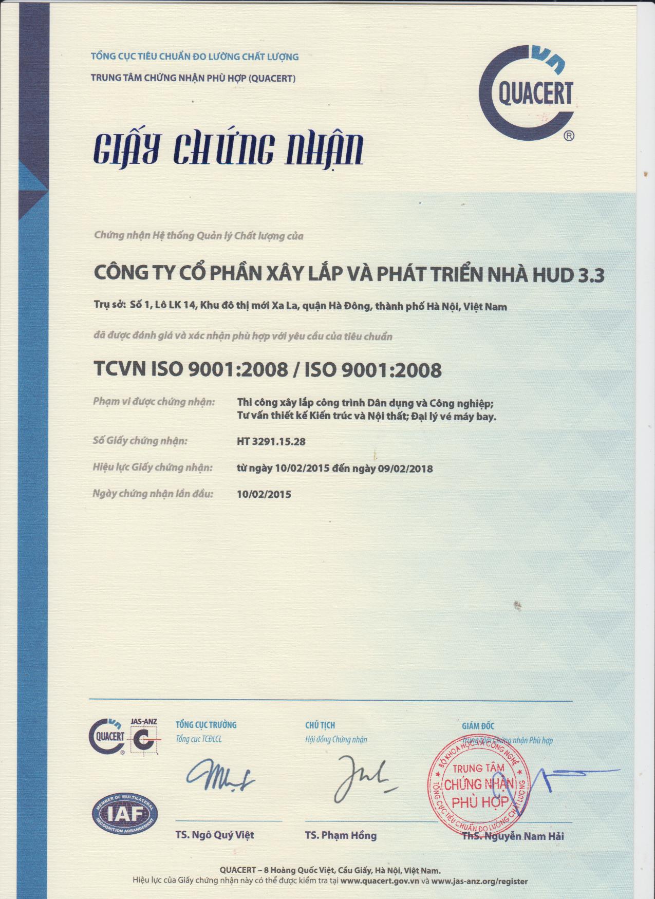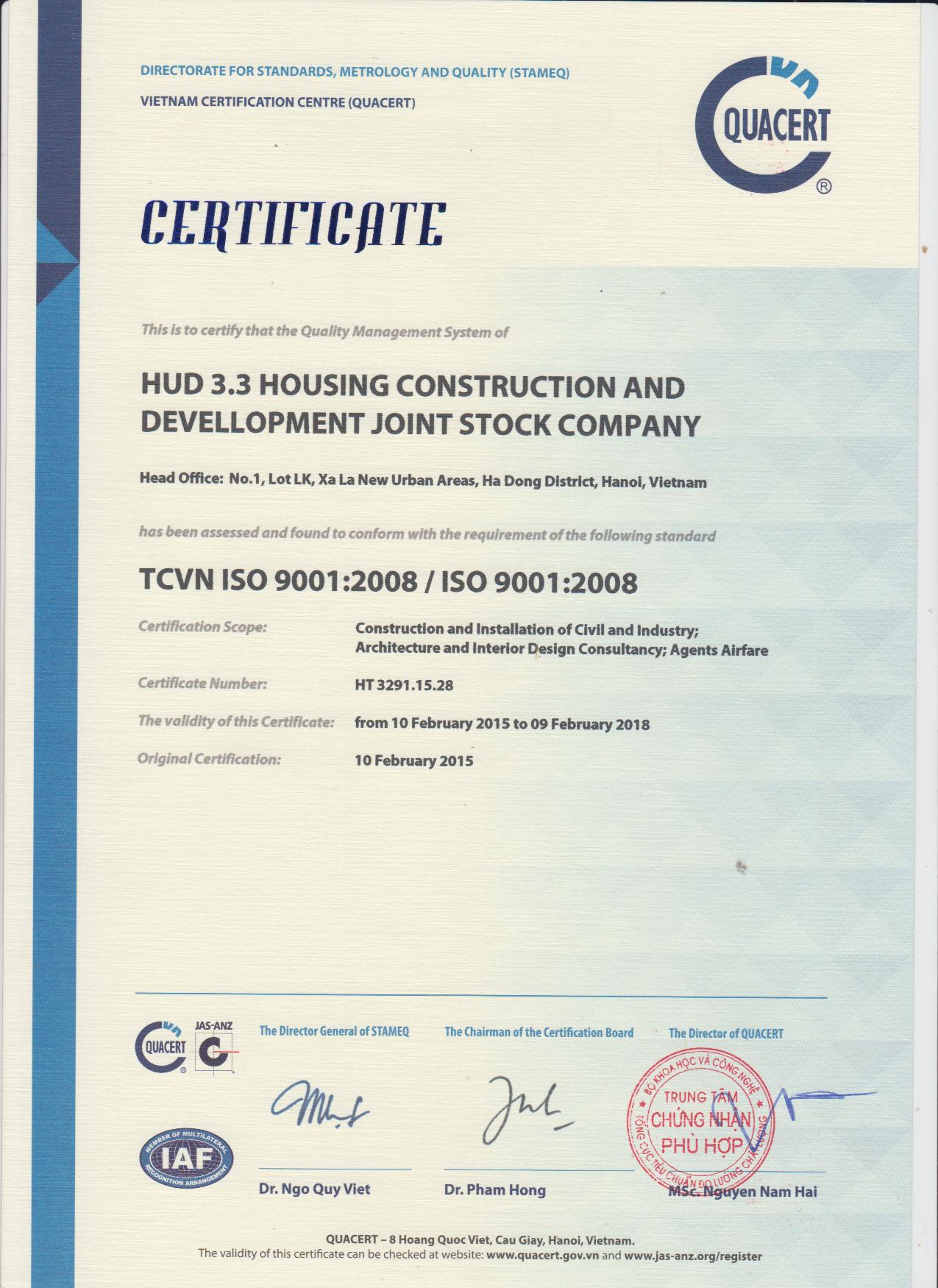 Ngày 12 tháng 02 năm 2015, Trung tâm chứng nhận sự phù hợp QUACERT - Tổng cục tiêu chuẩn đo lường chất lượng đã chính thức cấp Giấy chứng nhận Hệ thống quản lý chất lượng của Công ty CP xây lắp và phát triển nhà HUD3.3 phù hợp với tiêu chuẩn ISO 9001 – 2008.