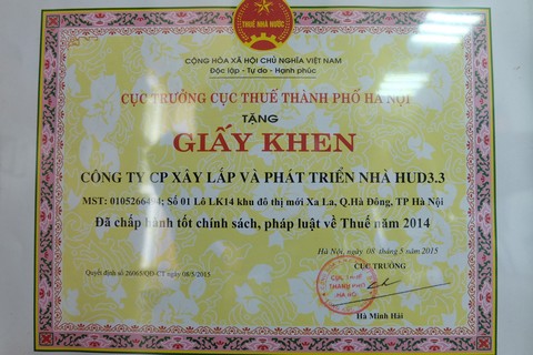 Thượng tuần tháng 6/2015 vừa qua, Cục thuế TP Hà Nội đã long trọng tổ chức tuyên dương 423 doanh nghiệp, cá nhân trên địa bàn thủ đô đã sản xuất kinh doanh hiệu quả và thực hiện tốt chính sách pháp luật thuế năm 2014. Công ty HUD3.3 cũng đã vinh dự được vinh danh trong Chương trình này.