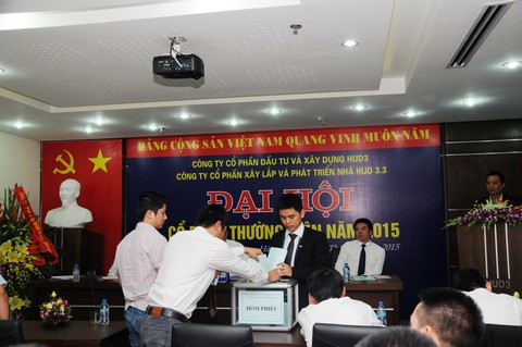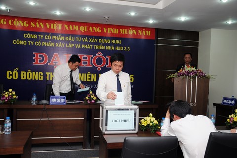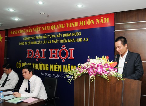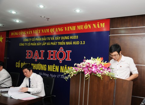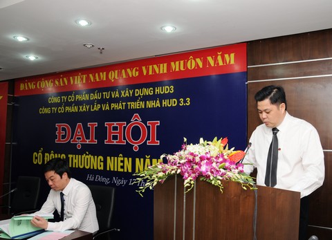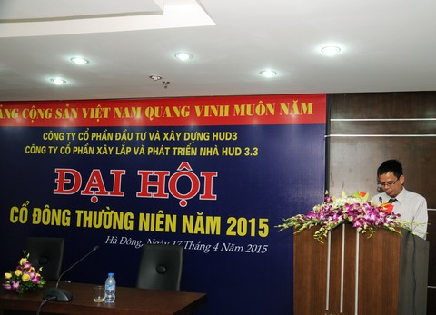 Ngày 17/04/2015 tại Phòng họp Tầng 5 – Toà nhà HUD3 TOWER. Số 121 - 123 Tô Hiệu, Phường Nguyễn Trãi, Quận Hà Đông, TP Hà Nội, HĐQT Công ty CP xây lắp và phát triển nhà HUD3.3 đã triệu tập Đại hội cổ đông thường niên năm 2015 nhằm thảo luận và thông qua các nội dung thuộc thẩm quyền của Đại hội.