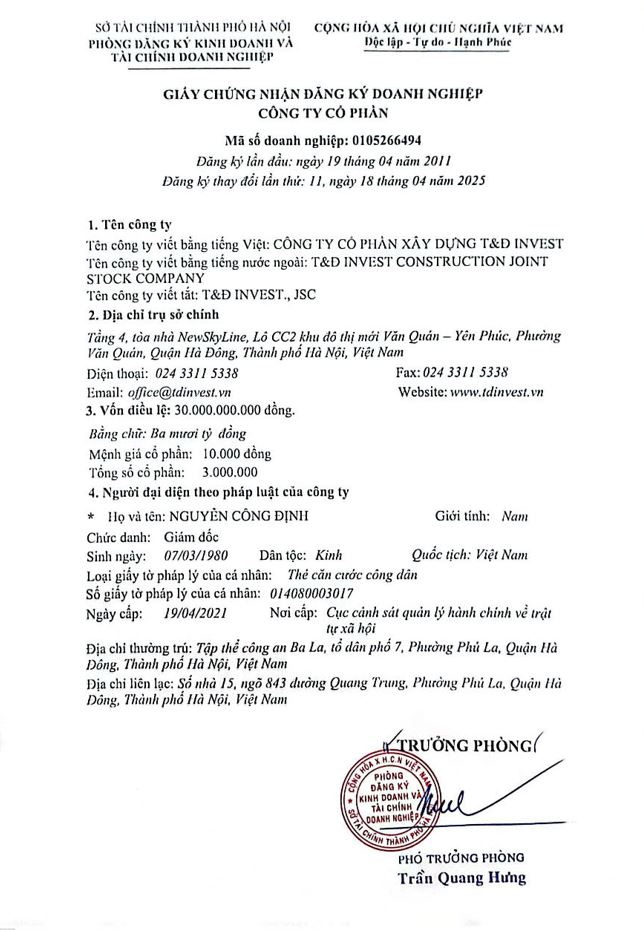 Căn cứ Giấy chứng nhận đăng ký doanh nghiệp của Công ty CP xây dựng T&Đ INVEST do Sở tài chính thành phố Hà Nội cấp thay đổi lần thứ 11, ngày 18 tháng 04 năm 2025;