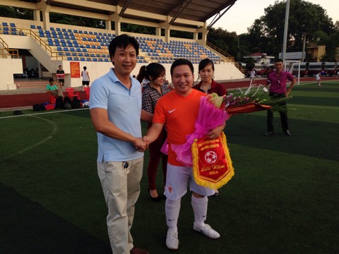 Ông Nguyên Công Định trao hoa và cờ lưu niệm cho đại diện 02 đội