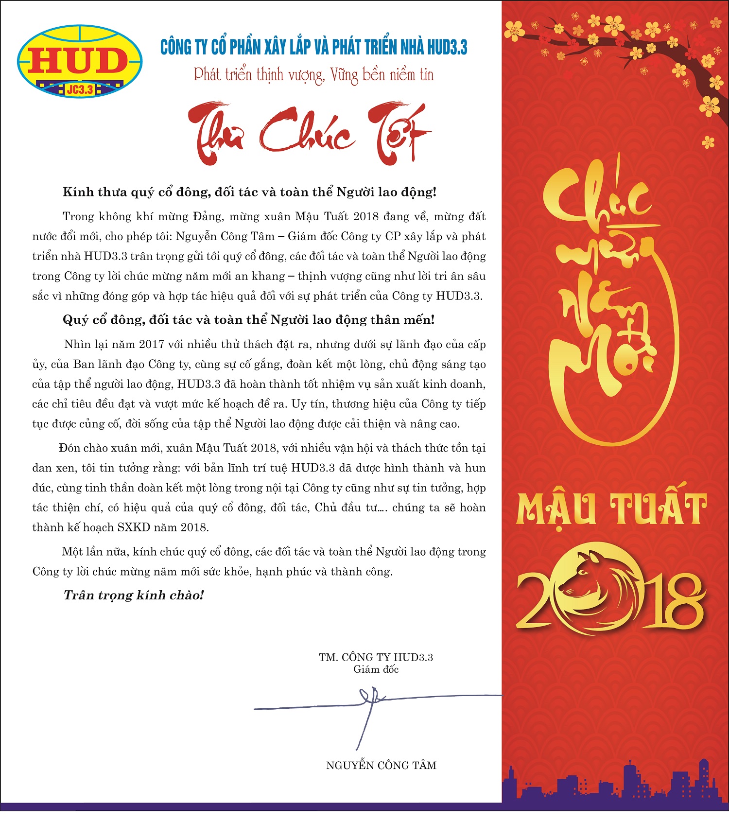Nhân dịp Tết đến - Xuân về, ông Nguyễn Công Tâm - Giám đốc thay mặt Ban lãnh đạo Công ty HUD3.3 gửi thư chúc tết, cùng với đó là lời tri ân sâu sắc cũng như lời chúc mừng năm mới tốt lành gửi đến quý cổ đông, đối tác, Chủ đầu tư và toàn thể Người lao động. Dưới đây là toàn văn thư chúc tết: