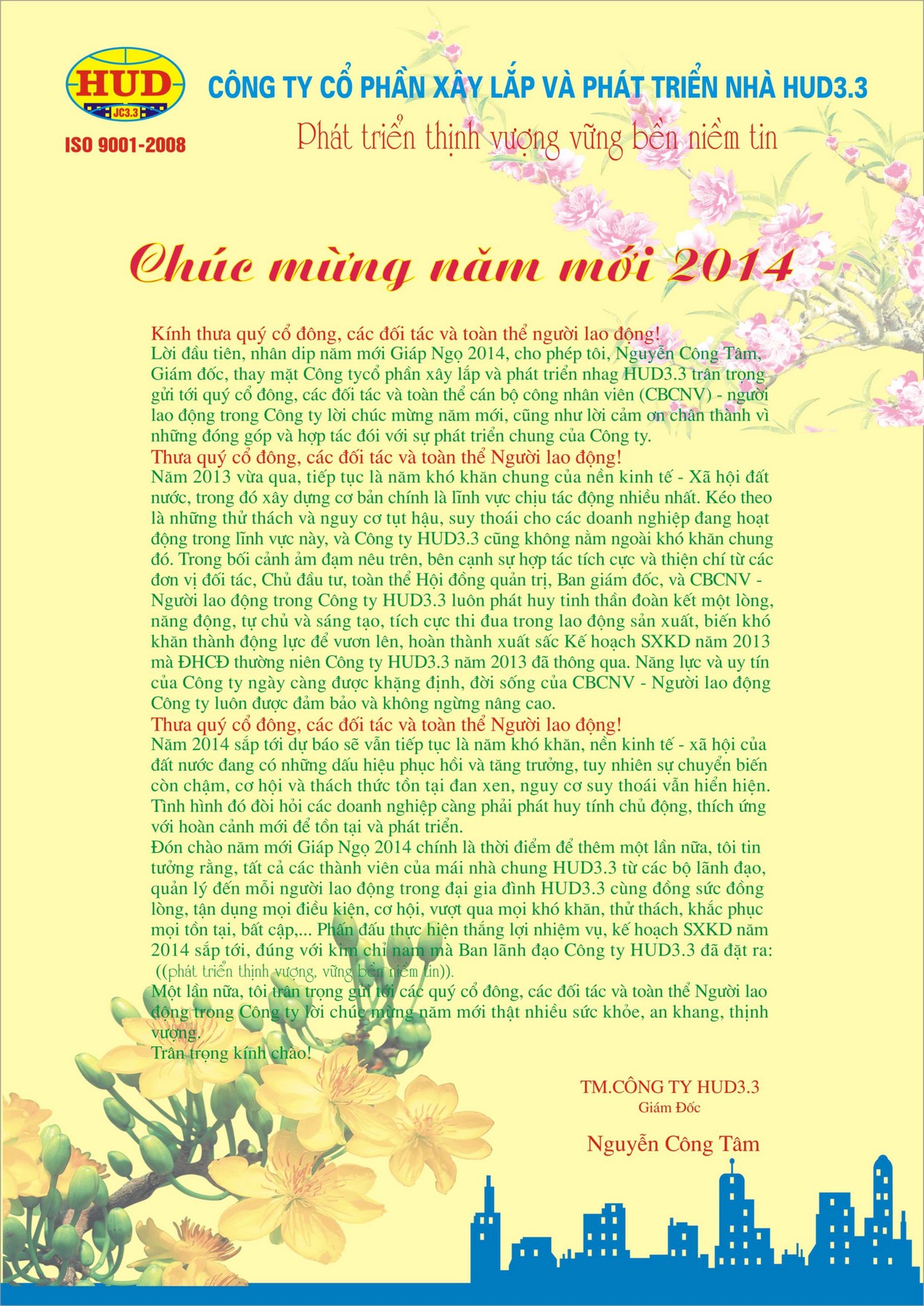 Nhân dịp năm mới 2014 xuân Giáp Ngọ, ông Nguyễn Công Tâm - Giám đốc Công ty HUD3.3 đã có những dòng tâm thư, như một lời tri ân gửi tới cổ đông, các đối tác, Chủ đầu tư và toàn thể CBCNV - Người lao động trong Công ty, cùng lời chúc mừng năm mới an khang, thịnh vượng.