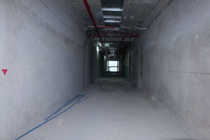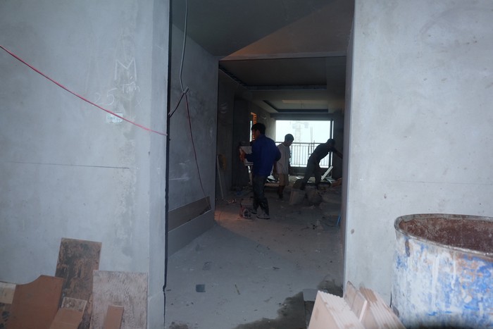 Trên các tầng, đội ngũ nhân công vẫn miệt mài triển khai phần hoàn thiện